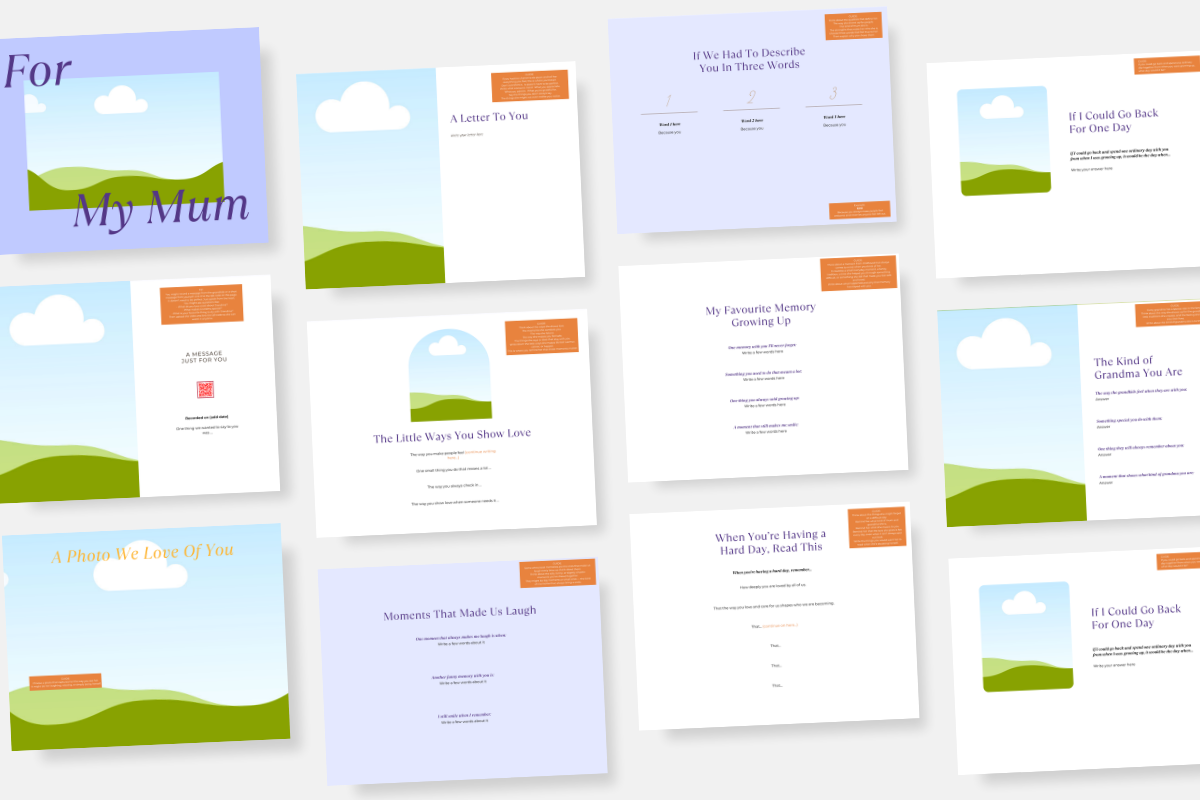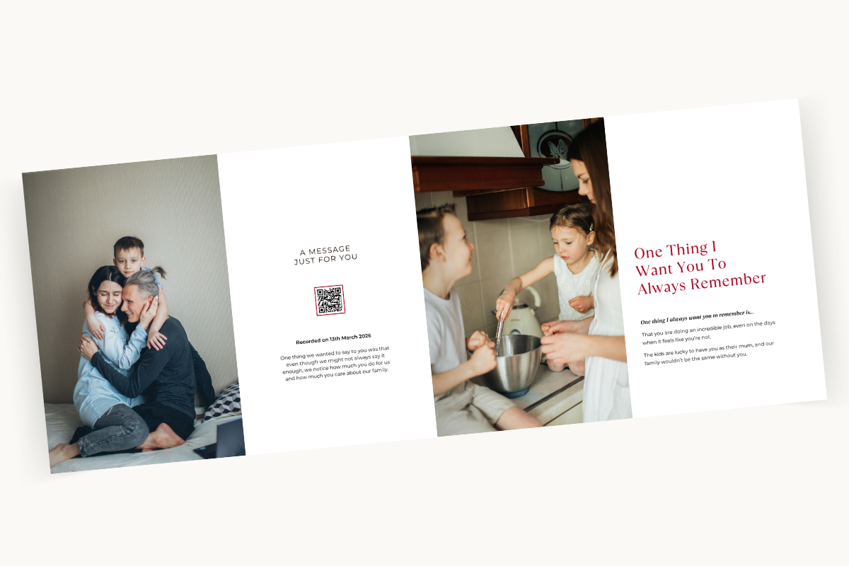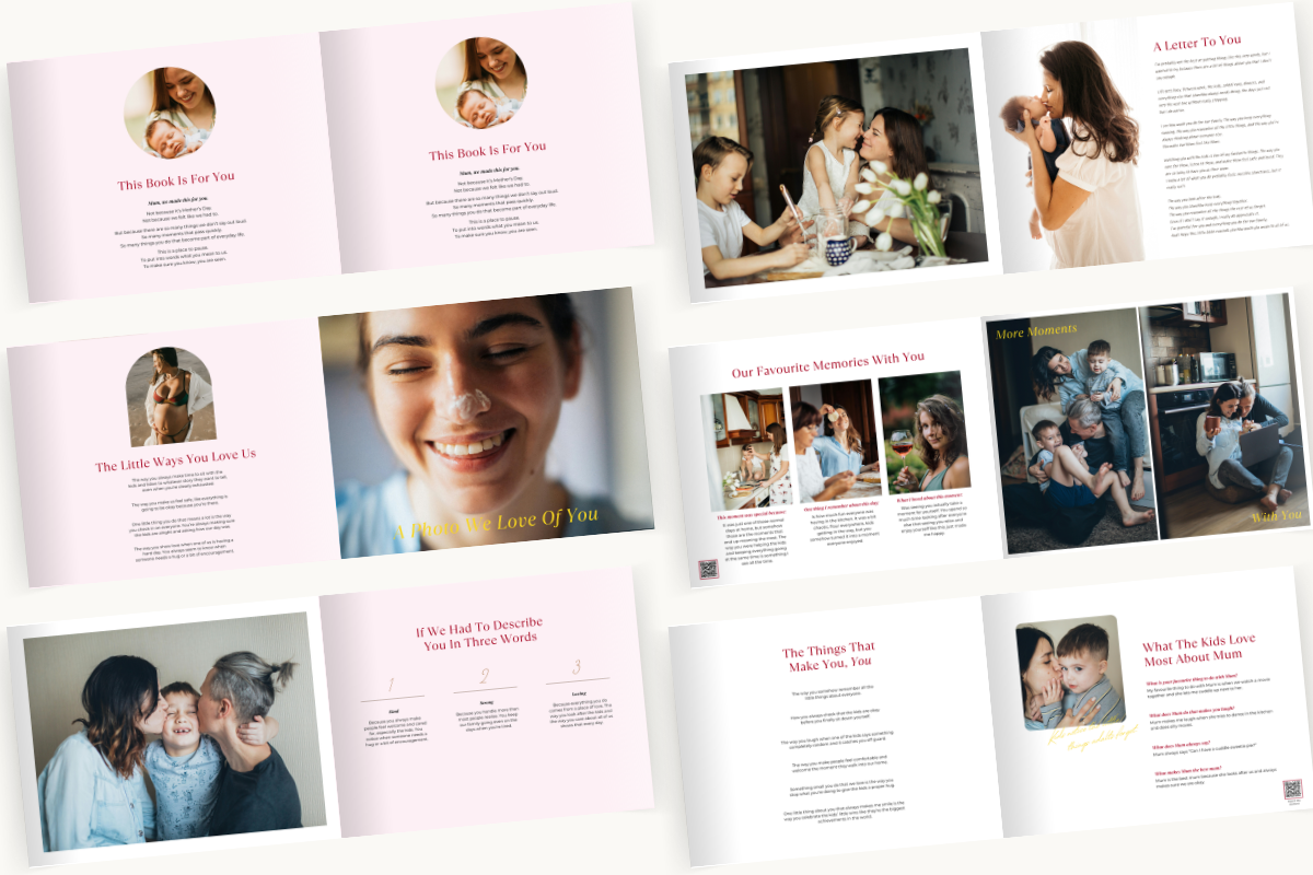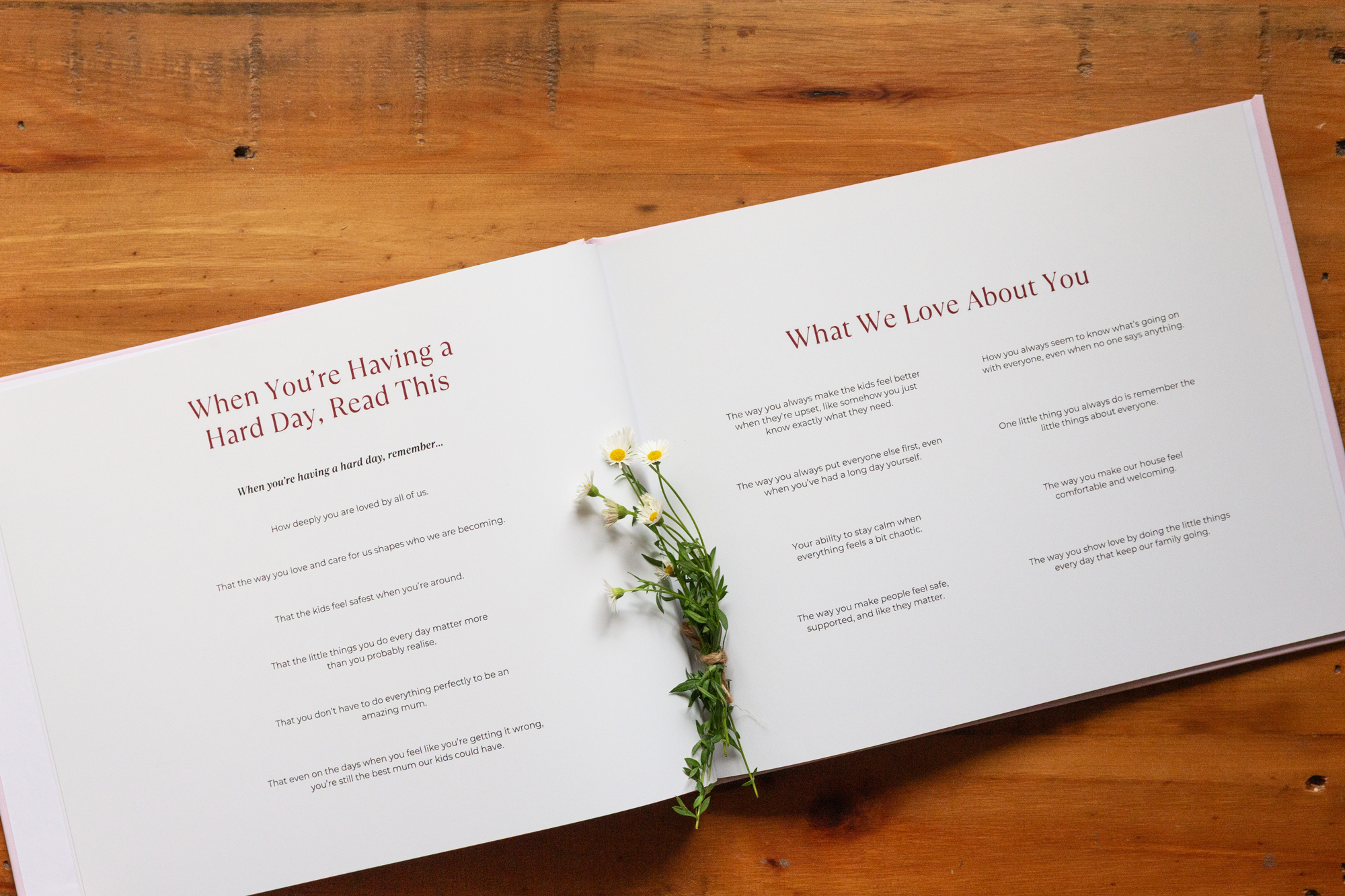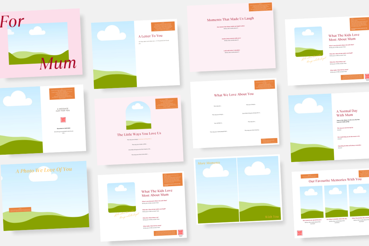 The For Mum (pink) template is designed for your partner, and your kids, to fill in for you. The prompts make it easy even if he's not a natural writer. Many mums send the link with a gentle hint. Others fill it in together as a family. Either way, it works.