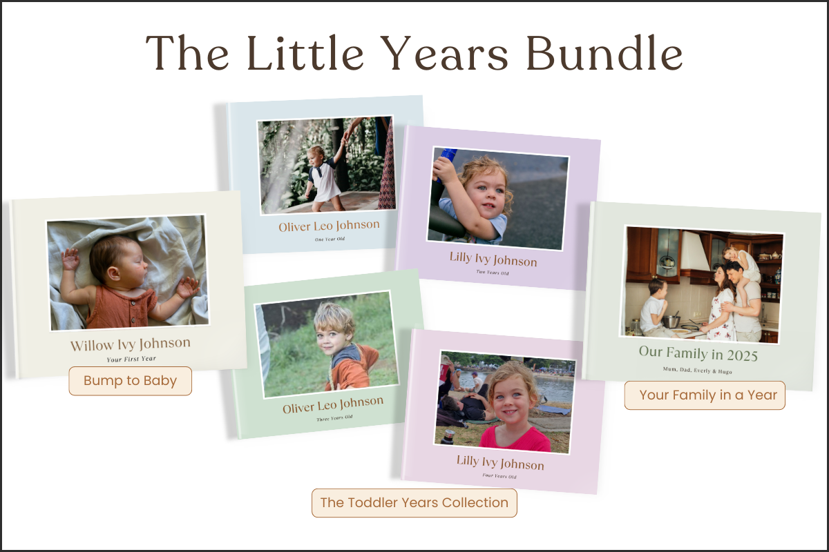 This all-in-one bundle includes 6 beautifully designed Canva templates, thoughtfully written to capture your child’s story — and yours — from pregnancy through to age 4, plus a full year of family life.